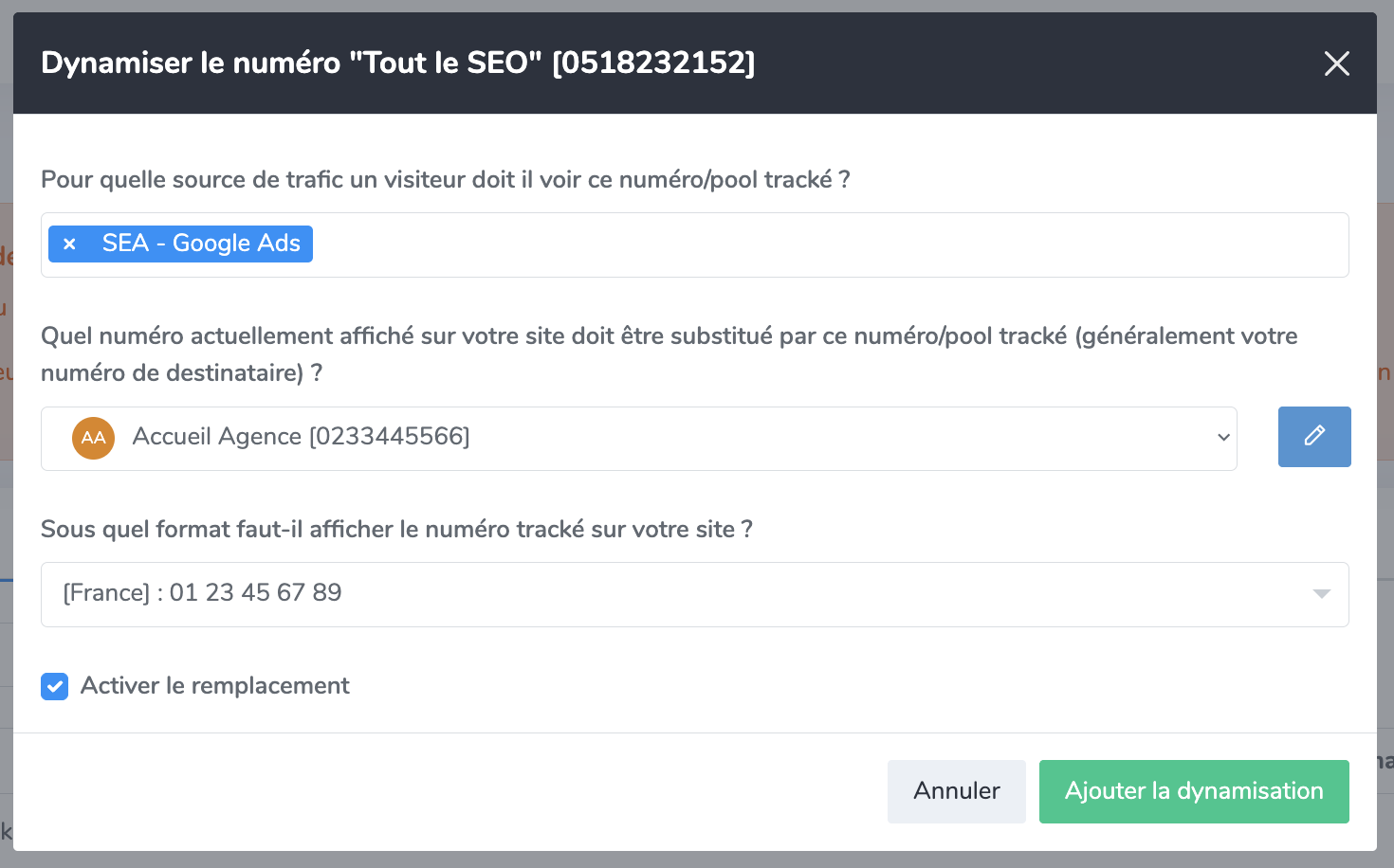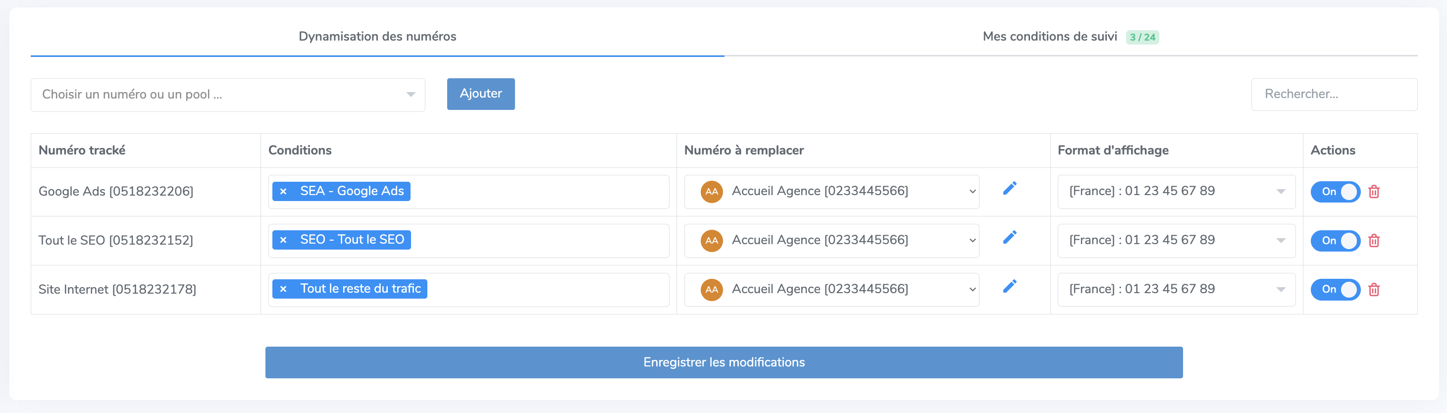 Ajouter les numéros en rotation : associer source → numéro tracké → numéro remplacé → format.