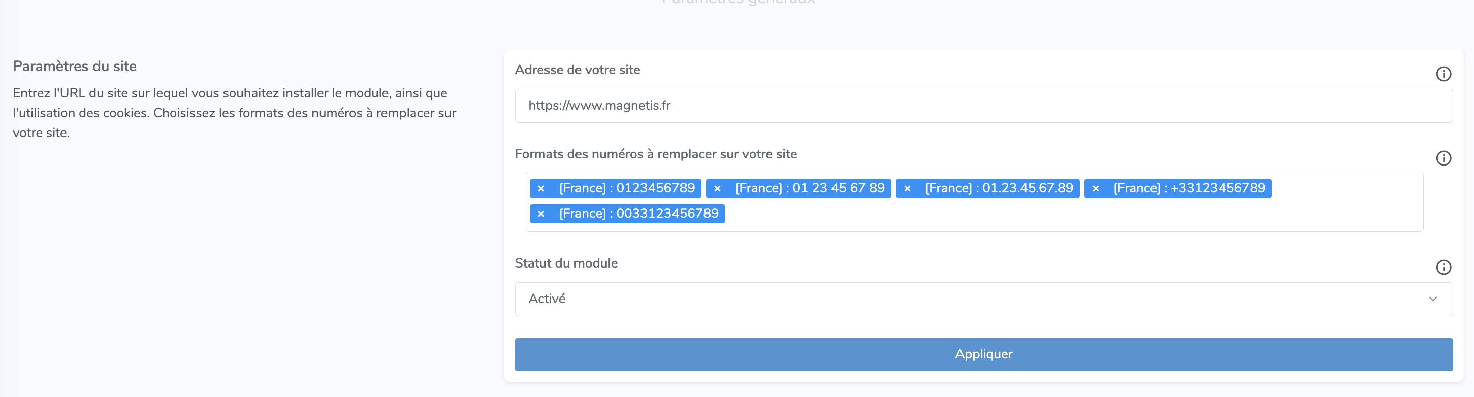 Configurer les paramètres avancés (site, RGPD, détection/remplacement, ID tracking, durée du suivi).