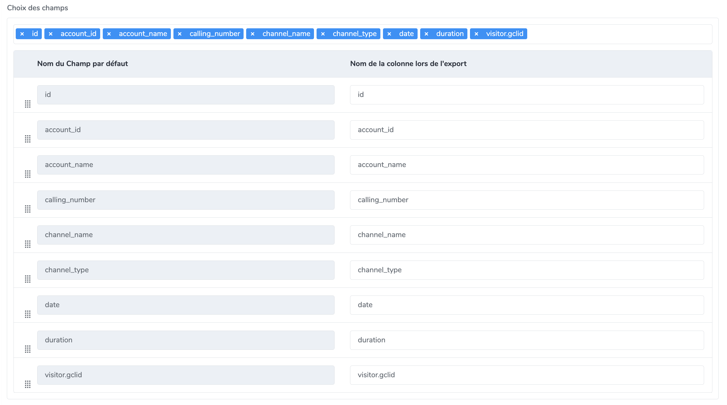 Personnalisation de l'ordre : Une fois les champs sélectionnés, vous pouvez modifier l'ordre des colonnes par simple glisser-déposer pour qu'il corresponde au format attendu par votre outil d'import.