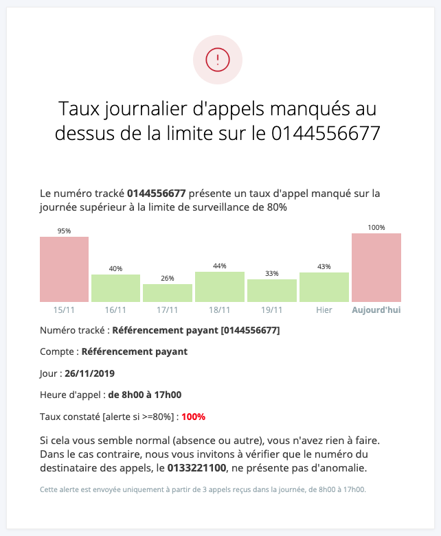 Oui, vous pouvez définir un seuil journalier (par défaut : 80 % d’appels manqués avec au moins 3 appels dans la journée).