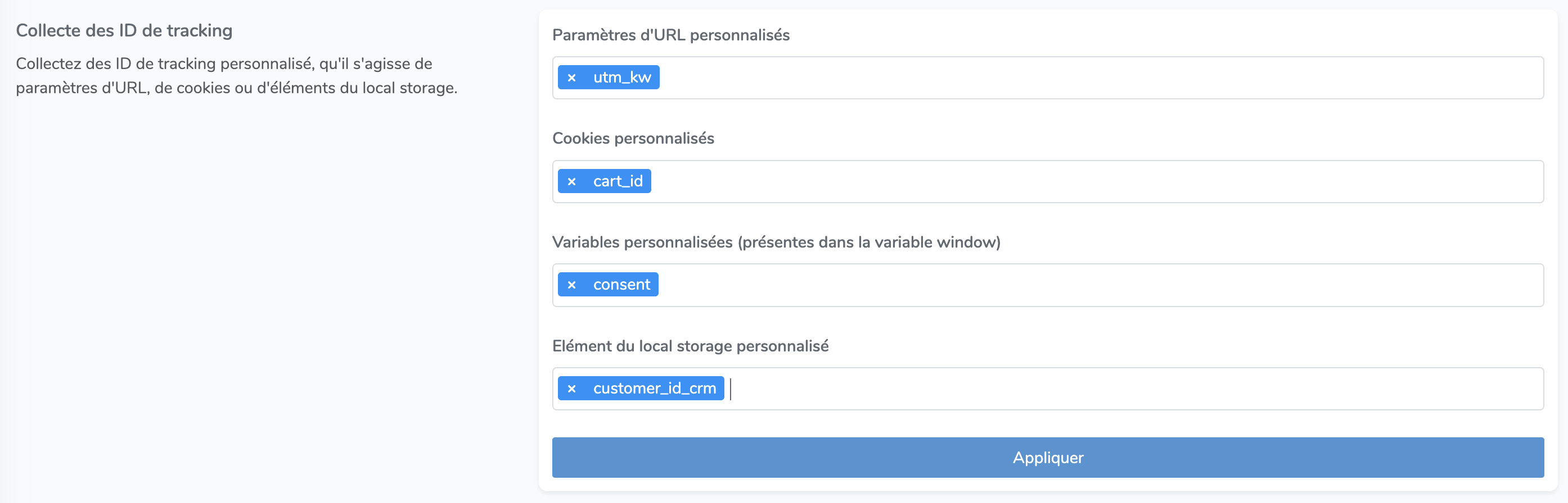 Cette personnalisation vous permet d’aller au-delà des simples données standard (UTMs classiques, source/campagne, etc.) et de capter des informations stratégiques comme des IDs de panier, des identifiants utilisateurs ou des variables spécifiques à votre site.