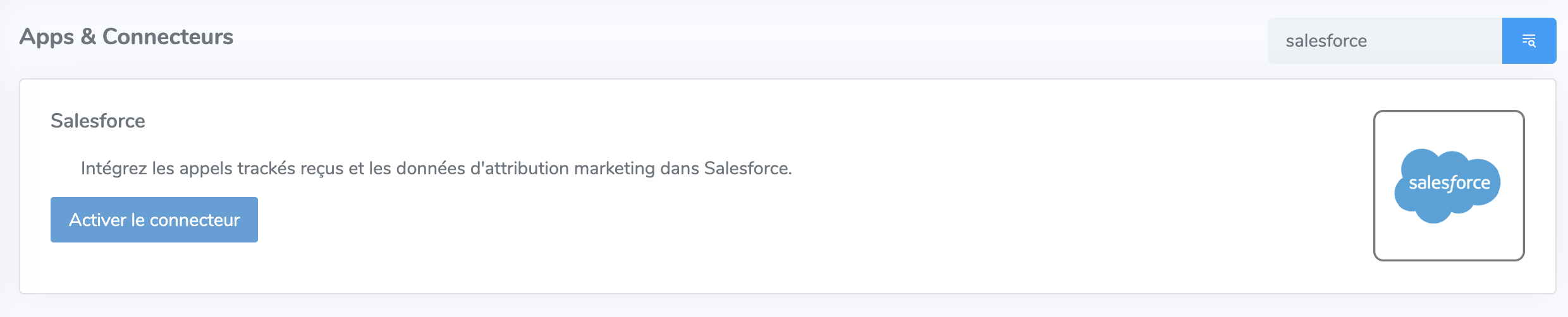 Détail d'un appel : En cliquant sur un appel spécifique, vous verrez les statuts de synchronisation vers Salesforce dans la timeline de l'appel.