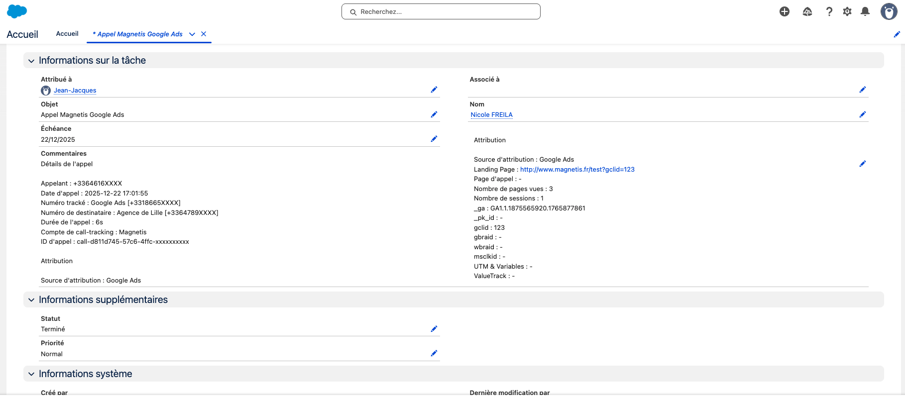 Si vous avez configuré la recherche dans les "Leads et Contacts", Magnétis associera automatiquement l'appel (la Tâche) à la fiche existante correspondante, enrichissant ainsi l'historique client sans créer de doublon.