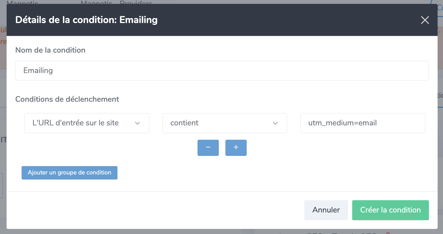 Ajoutez une condition personnalisée avec vos paramètres de campagne (ex. utm_medium=email