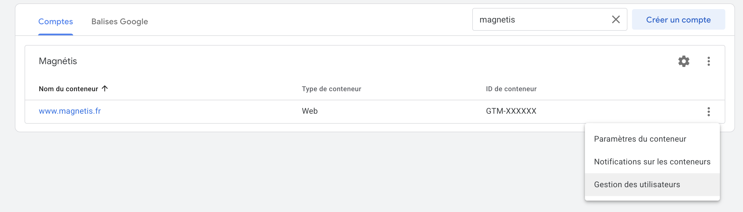 Le suivi des performances marketing et l’optimisation de votre call-tracking passent souvent par une configuration précise dans Google Tag Manager (GTM). Pour que l’équipe Magnétis puisse vérifier l’installation du module de call-tracking ou mettre en place une spécificité (ex. déclencheurs personnalisés, tracking avancé), il est parfois utile de partager l’accès à votre conteneur GTM.