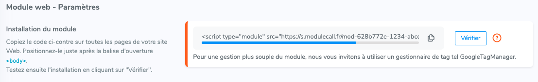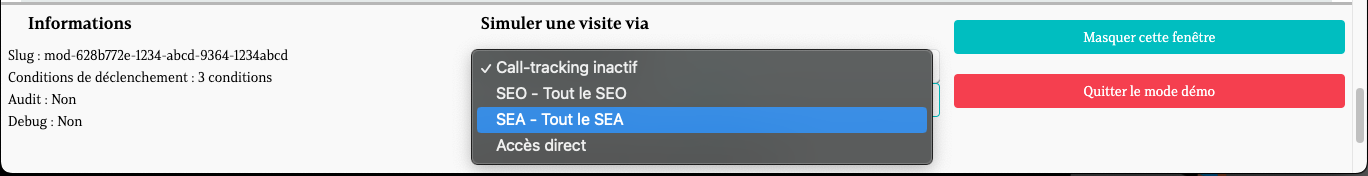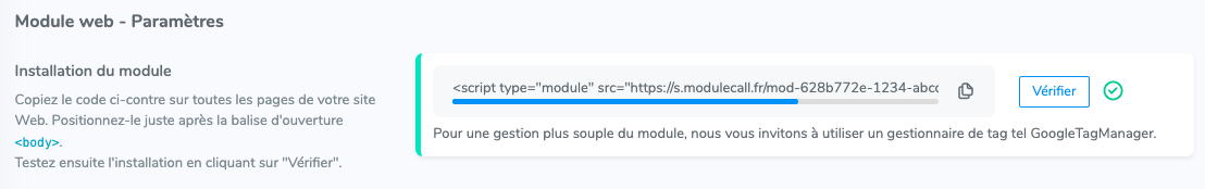 Si une ligne s'affiche avec le code du module de call-tracking, le module est bien présent sur votre site.