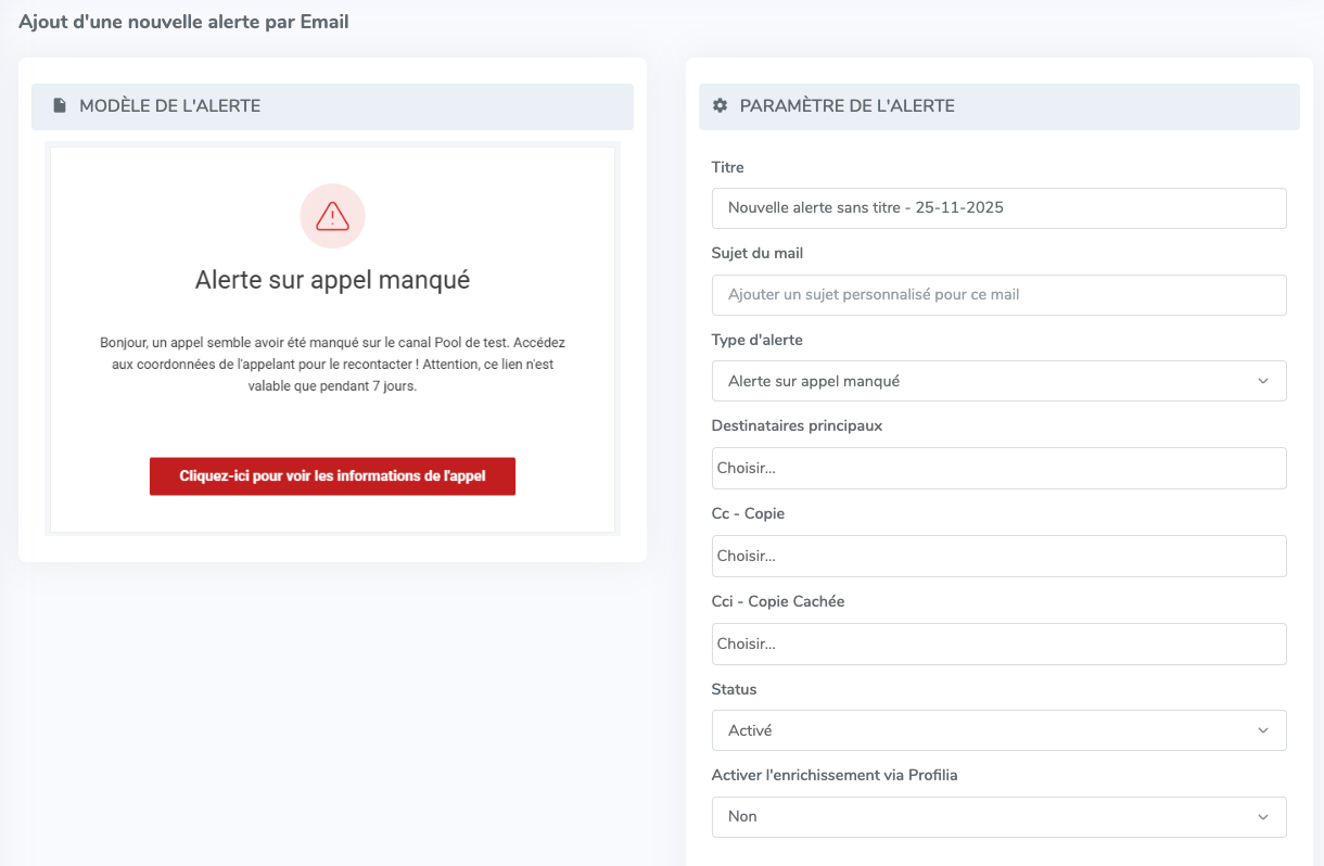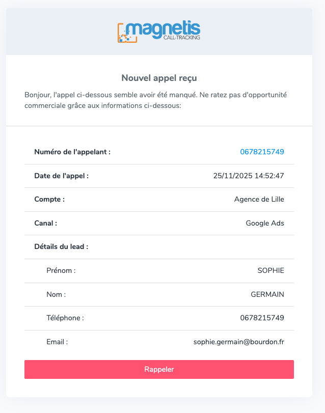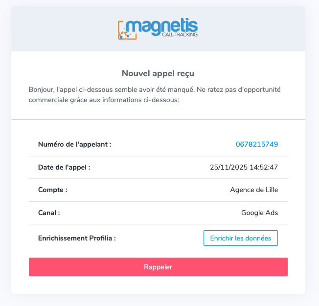 Lorsqu'un appel est manqué, vous recevez une alerte email.